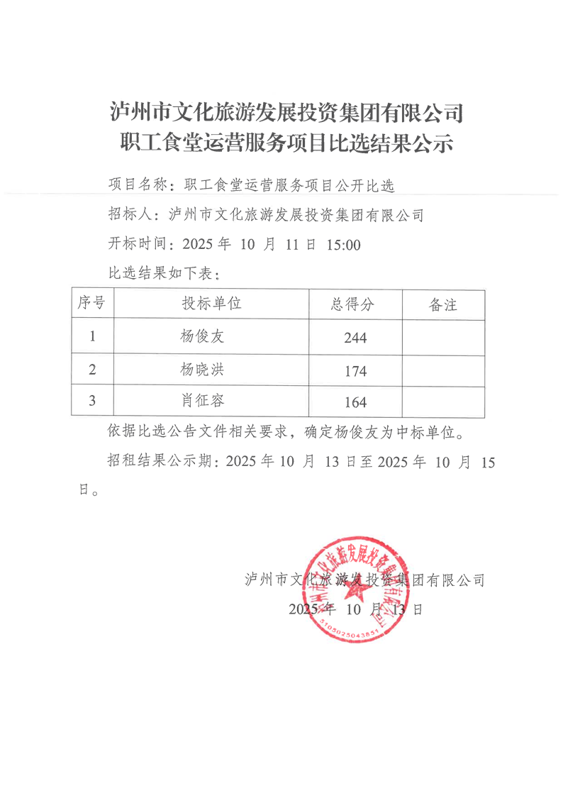 瀘州市文化旅游發(fā)展投資集團有限公司職工食堂運營服務(wù)項目比選結(jié)果公示